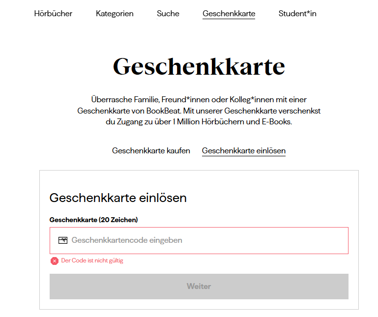 Gutschein-Code eingeben: Besuche die BookBeat-Website (https://www.bookbeat.de/) und klicke auf den Link "Geschenkkarte einlösen".