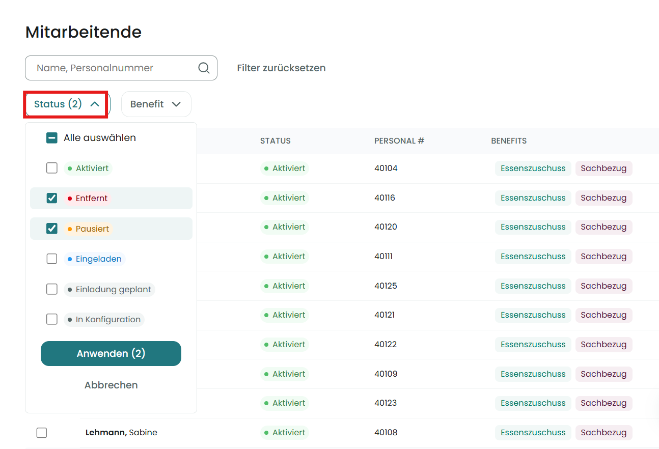 - Praktische Übersicht: Sie erhalten eine praktische Übersicht über alle teilnehmenden, pausierten oder entfernten Mitarbeitenden.