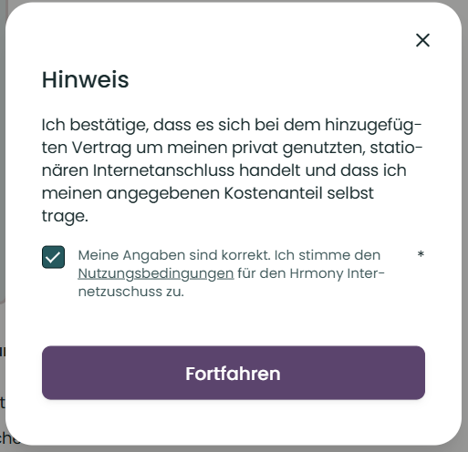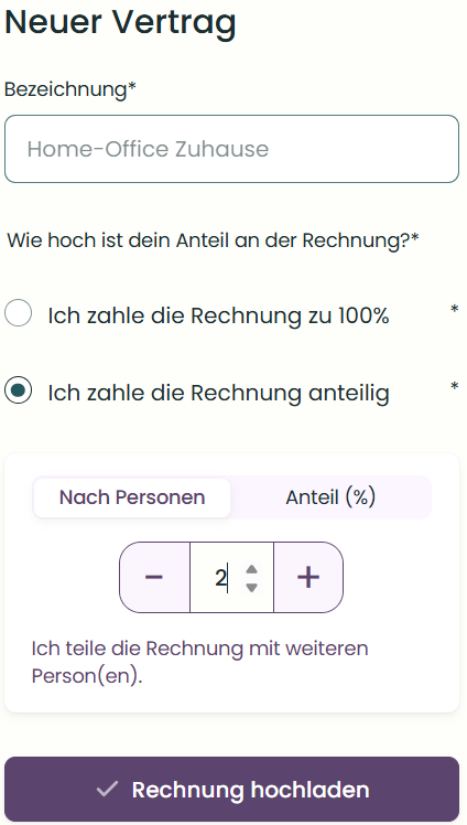 Falls du dir den Internetanschluss mit anderen teilst (z.B. in einer WG oder mit dem/der Partner:in), gib bitte deinen eigenen Kostenanteil an und bestätige dies in der App. Der Vertrag muss dafür nicht auf deinen Namen lauten, solange du deinen Kostenanteil selbst trägst.
